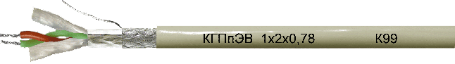 Пары с многопроволочными медными лужеными проводниками диаметром 0,78(7×26) мм, с изоляцией из пористого полиэтилена, в общем экране из алюмолавсановой ленты и оплетки из медных луженых проволок плотностью 65% с дренажным проводником. В оболочке из поливинилхлоридного пластиката для эксплуатации в закрытых помещениях – КГПпЭВ или светостабилизированного полиэтилена для эксплуатации на открытом воздухе – КГПпЭП или термопластичного полиуретана для эксплуатации в химически агрессивных средах с воздействиями вибрации и тряски – КГПпЭУ.