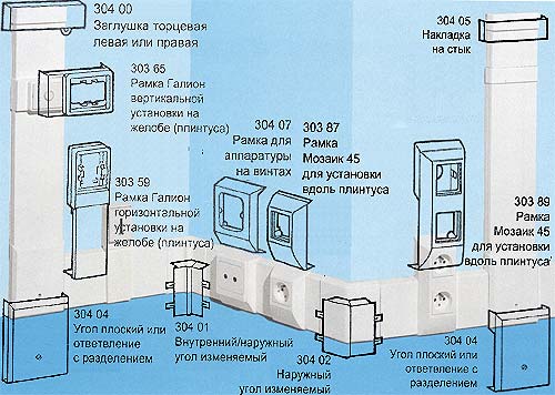 Для установки на плинтусе Поставляется с планкой для разделения слабых и сильных токов Емкость: 2 модуля Мозаик 45 |