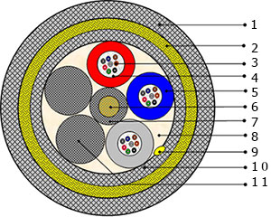 Силовой элемент в центре кабеля выполняется из прочного материала — стеклопластика. Вокруг стеклопластика расположены оптические модули, защищенные толстым слоем арамидных нитей. Оболочка – невоспламеняемый материал. Все свободное и межмодульное пространство заполняется водоотталкивающим веществом (гелем).
