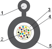Особенность оптического кабеля ОКПЦ заключается в наличии центральной трубки, в которой содержатся оптические волокна в количестве до 24 штук. Кроме того, кабель ОКПЦ имеет выносной силовой элемент. Данный стержень выполняется из стеклопластика, известного прочностью и устойчивостью к электромагнитным излучениям. Стержень также может быть выполнен из стали в виде троса или проволоки. Внешняя оболочка является гибкой и упругой и выполняется из полиэтилена.