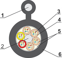 Основу данного кабеля составляет стекло пластиковый стержень, выполняющий роль центрального силового элемента. Кабель классифицируется как подвесной. Каждый модуль, навитый вокруг сердечника, может содержать до 24 оптических волокон. Кроме того, в модули при необходимости могут входить кордели, имеющие выносной силовой элемент. Силовой элемент может быть выполнен из стальной проволоки или троса, а также из стекло пластикового стержня. Внешняя оболочка кабеля из высокопрочного противопожарного полиэтилена, по своим свойствам и прочности не уступающий пожаробезопасному пластику.