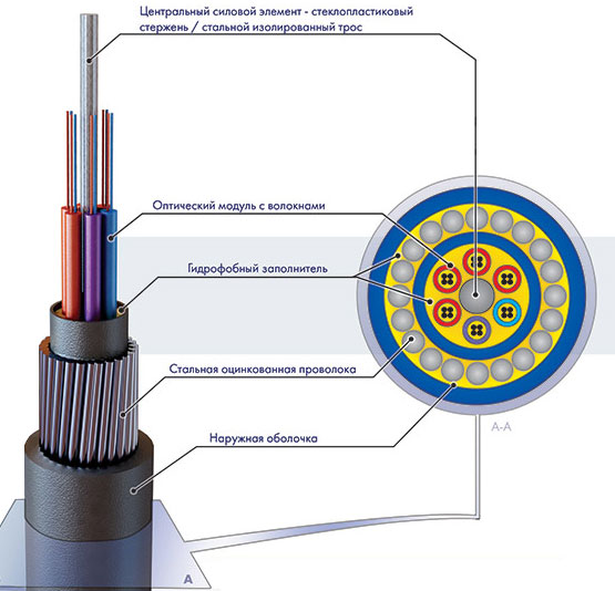 * Свободное пространство в оптическом модуле заполнено гидрофобным заполнителем. Оптические модули покрывает водоблокирующая лента.