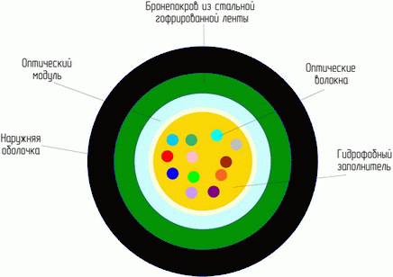 Кабель ОКЦ содержит центральный оптический модуль (ЦОМ), На ЦОМ наложен бронепокров из стальной гофрированной ленты. Бронепокров покрывает наружная оболочка из полиэтилена.
