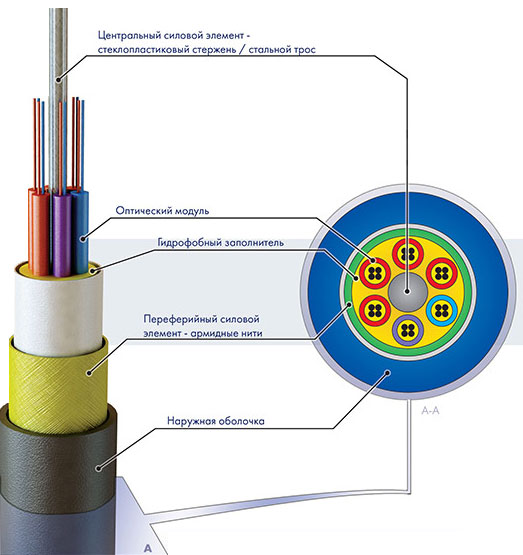 Кабели содержат центральный силовой элемент (ЦСЭ) из стеклопластика (Д) или изолированного полиэтиленом стального троса (М), вокруг ЦСЭ скручены оптические модули с волокнами и кордели. ЦСЭ обмотан водоблокирующими нитями.