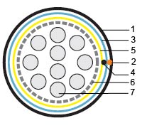 1 — Внешняя оболочка 2 — Рип-корд 3 — Экран-фольга 4 — Дренажный провод 5 — Защитная пленка 6 — Полимерная лента 7 — Витая пара solid |