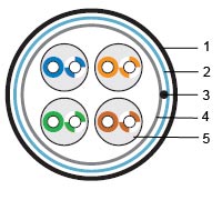 1 — Внешняя оболочка 2 — Экран-фольга 3 — Дренажный провод 4 — Защитная пленка 5 — Витая пара solid |