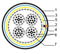 1 — Внешняя оболочка 2 — Рип-корд 3 — Экран-фольга 4 — Дренажный провод 5 — Защитная пленка 6 — Полимерная лента 7 — Витая пара solid |