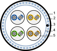 1 — Внешняя оболочка 2 — Экран-сетка 3 — Дренажный провод 4 — Экран-фольга 5 — Витая пара patch |