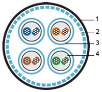1 — Внешняя оболочка 2 — Экран-сетка 3 — Экран-фольга 4 — Витая пара patch |