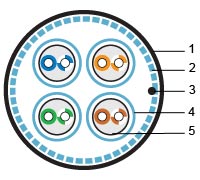 1 — Внешняя оболочка 2 — Экран-сетка 3 — Дренажный провод 4 — Экран-фольга 5 — Витая пара solid |