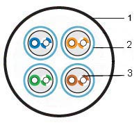 1 — Внешняя оболочка 2 — Экран-фольга 3 — Витая пара solid |