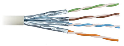 Кабель состоит из 4 незаземленных экранированных витых пар, свитых вместе и защищенных ПВХ-оболочкой серого цвета.