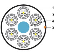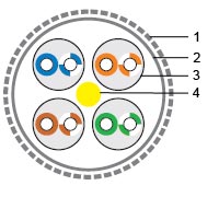 1 — Внешняя оболочка 2 — Рип-корд 3 — Пучок из 4-х витых пар solid 4 — Центральный силовой элемент |