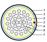 1 — Внешняя оболочка 2 — Рип-корд 3 — Экран-фольга 4 — Дренажный провод 5 — Защитная пленка 6 — Витая пара solid 7 — Полимерная лента |