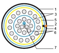 1 — Внешняя оболочка 2 — Рип-корд 3 — Экран-фольга 4 — Дренажный провод 5 — Защитная пленка 6 — Витая пара solid 7 — Центральный силовой элемент |