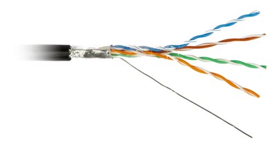 Тип кабеля и количество пар: кабель FTP (foiled twisted pair — витая пара с общим экраном из фольги и медным проводником для отвода наведенных токов) для внешней прокладки, 4 пары (solid), категория 5e.