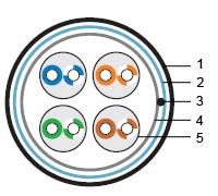1 — Внешняя оболочка 2 — Экран — фольга 3 — Дренажный провод 4 — Защитная пленка 5 — Витая пара solid |