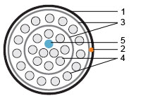 1 — Внешняя оболочка 2 — Рип-корд 3 — Защитная пленка 4 — Витая пара solid 5 — Центральный силовой элемент |