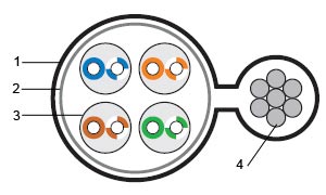 1 — Внешняя оболочка 2 — Защитная пленка 3 — Витая пара 4 — Металлический трос |
