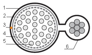 1 — Внешняя оболочка 2 — Защитная пленка 3 — Рип-корд 4 — Полимерная лента 5 — Витая пара solid 6 — Металлический трос |