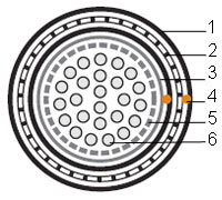 1 — Внешняя оболочка 2 — Бронированная оболочка 3 — Защитная пленка 4 — Рип-корд 5 — Полимерная лента 6 — Витая пара solid |