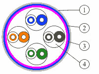 ![]() Разрез кабеля: 1 — оболочка; 2 — 1й слой фольги; 3 — 2й слой фольги; 4 — рара; 5 — дренаж; 6 — кевларовая нить. |