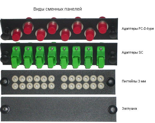 SC-типа (SC/APC, SC/UPC) (8 адаптеров на панели), FC-типа (самозакручивающиеся адаптеры, D-type) (8 адаптеров на панели), панель под пигтейлы (24 пигтейла на панели) |