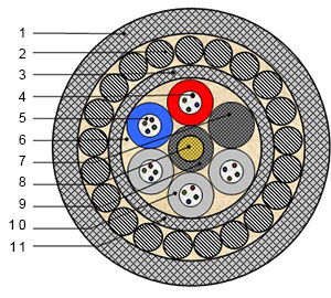 Силовой центральный элемент выполнен из стеклопластика. Оптические волокна с внутренней гидрофобной оболочкой располагаются вокруг этого элемента. Оболочка имеет 1-2 бронированных защитных слоя, выполненных из обмотки стальной проволоки. Верхний защитный слой производится из пожаробезопасного полиэтилена или пластика, не распространяющего горение.