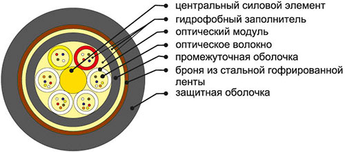 В основе кабеля данной марки находится модульный сердечник, центральный силовой элемент которого выполнен из стеклопластика. Вокруг стеклопластикового прутка накручиваются оптические модули с использованием метода правильной SZ-скрутки.